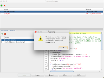 I found the solution to this in Heli’s book on SQL Developer Data Modeler, but thought I could add the easy way to solve this on your Mac. You need to download an extension to your JDK installation. A jar-file can be downloaded from http://jruby.org/download (There are two main versions, I decided to go for the the 1.X one). Look for the jar-file, currently I downloaded jruby-complete-1.7.23.jar.