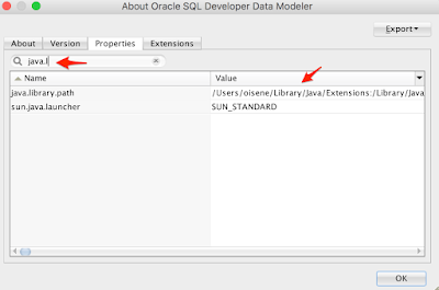 You need to figure out where to put this jar file. In SQL Developer Data Modeler, check your java.library.path setting by going to Help -> About. Then click on the Properties tab. There are a lot of them, so in stead of scrolling down, start writing in the search field “java.l” as shown: