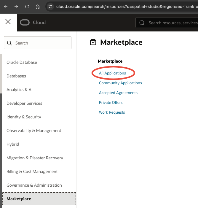 After you’ve logged into cloud.oracle.com, click on the hamburger menu in the top-left corner, scroll down, click Marketplace and finally on All Applications as shown here: