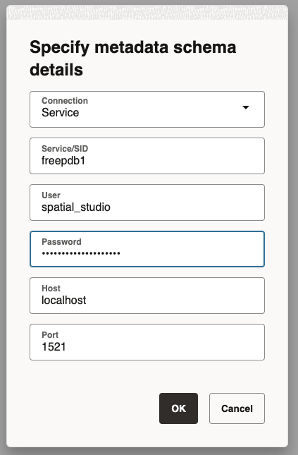 Spatial Studio needs an Oracle database to store the metadata. In this case I am using a local Oracle database, FREE version, running in podman as explained here , but any Oracle database should work (I haven’t tried all the versions). You can also use an Oracle Autonomous Database. Section 2.4 explains how to create the user for the metadata. Here is what I did: